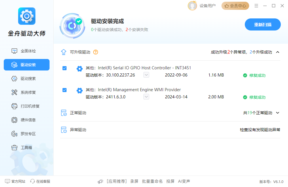 通过扫描,软件可以检测识别出可升级驱动、正常驱动和异常驱动,并提供自动指定修复方案,一键进行修复