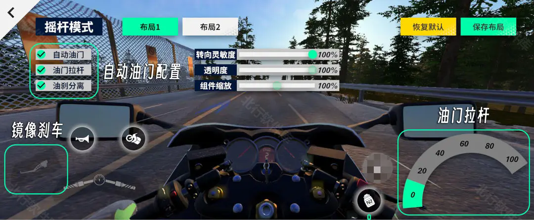 在自动油门状态下可以激活“油门拉杆”和“油刹分离”两个可选项:勾选出“油门拉杆”面板后可以在驾驶中控制合适的动力输出百分比,调整小摩托踩油门的力度;勾选出“油刹分离”时,刹车按键会镜像翻转并自动移至屏幕左侧,更适配左侧刹车操作手感。