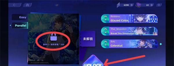 Parallel,Rhythm和Havoc难度需要达成一定的条件才可解锁,本曲的Parallel难度需消耗500棱镜,数量足够后点击UNLOCK以解锁此难度。不同的乐曲和难度,解锁条件也不尽相同,注意解锁条件。