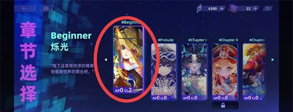 左右拖动屏幕可查看其他章节,点击任一图标即可进入对应章节曲目选择界面。下面的AP代表本章节内乐曲的满分个数,CL代表解锁并游玩乐曲的个数(进入章节选择不同的难度,外面的AP和CL显示也会有对应的变化)