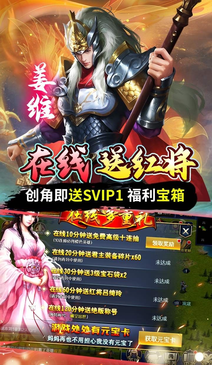 全游戏全档位承诺永享0.05折 创角即送SVIP1、福利宝箱、88个抽奖券、8888元宝、888万银两 在线送吕绮玲、横空出世称号 无限元宝卡13大福利重叠领取 天天登录天天领总计十万真充 每日在线、签到可领120抽和材料 。