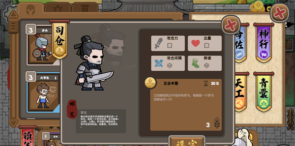 2、角色成长系统:通过战斗积累经验,提高将军的能力,解锁新技能,增强战斗力。
