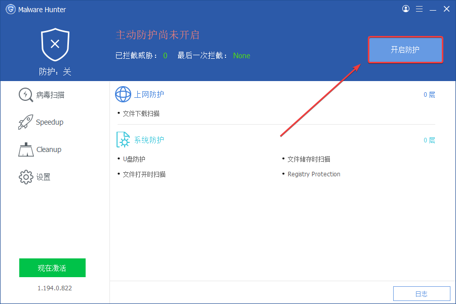 1、打开Malware Hunter之后,可以看到左上角显示【防护:关】,直接点击该区域