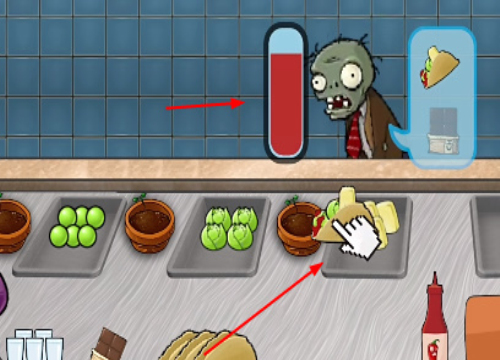 僵尸的耐心会提升,到达顶点之后将发生不好的事情,需要快速制作出对应的沙威玛美食来给与对方。