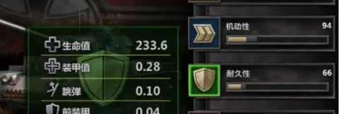 耐久度分为生命值、装甲值、跳弹、前装甲四个类型。