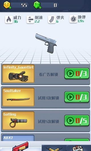 每次通关关卡还有新武器解锁,待进度条满时,即使不用解锁你也会有新的武器可以使用。