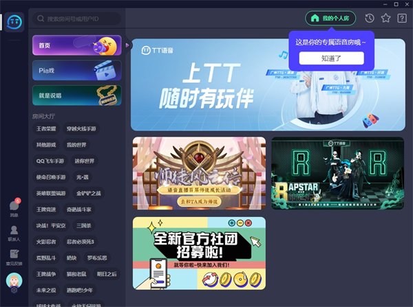 TT语音电脑版是一个实用的语音聊天工具,在游戏开黑时,能够为你提供稳定、高清、流畅、低延迟的语音通话体验,与游戏好友畅快交流,讨论战术。大厅内有超多热门游戏专区,在这里可以快速找到优质游戏伙伴一起开黑。还有丰富的语音房间等你体验,感兴趣的玩家快来下载TT语音使用吧。