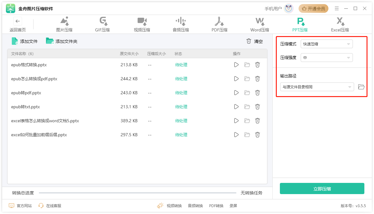 软件支持将常用的PPT文件压缩,.ppt、.pptx均可压缩,分别有两种压缩模式: