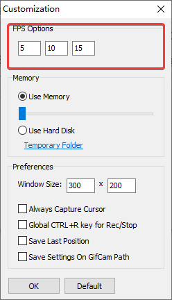 设置录制参数:在【自定义】窗口中,可以对 FPS、内存等进行单独设置。FPS 即每秒播放的帧数,可根据需要调整,一般来说,10FPS-16FPS 较为常用,数值越大,录制的画面越流畅,但生成的文件体积也会越大。若不熟悉各项参数,也可直接默认推荐设置,然后点击【确定】.