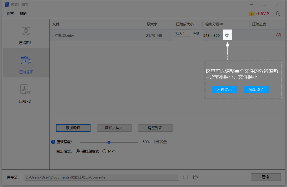 可自行调整压缩设置,如:图片视频分辨率、清晰度、输出格式、压缩强度等