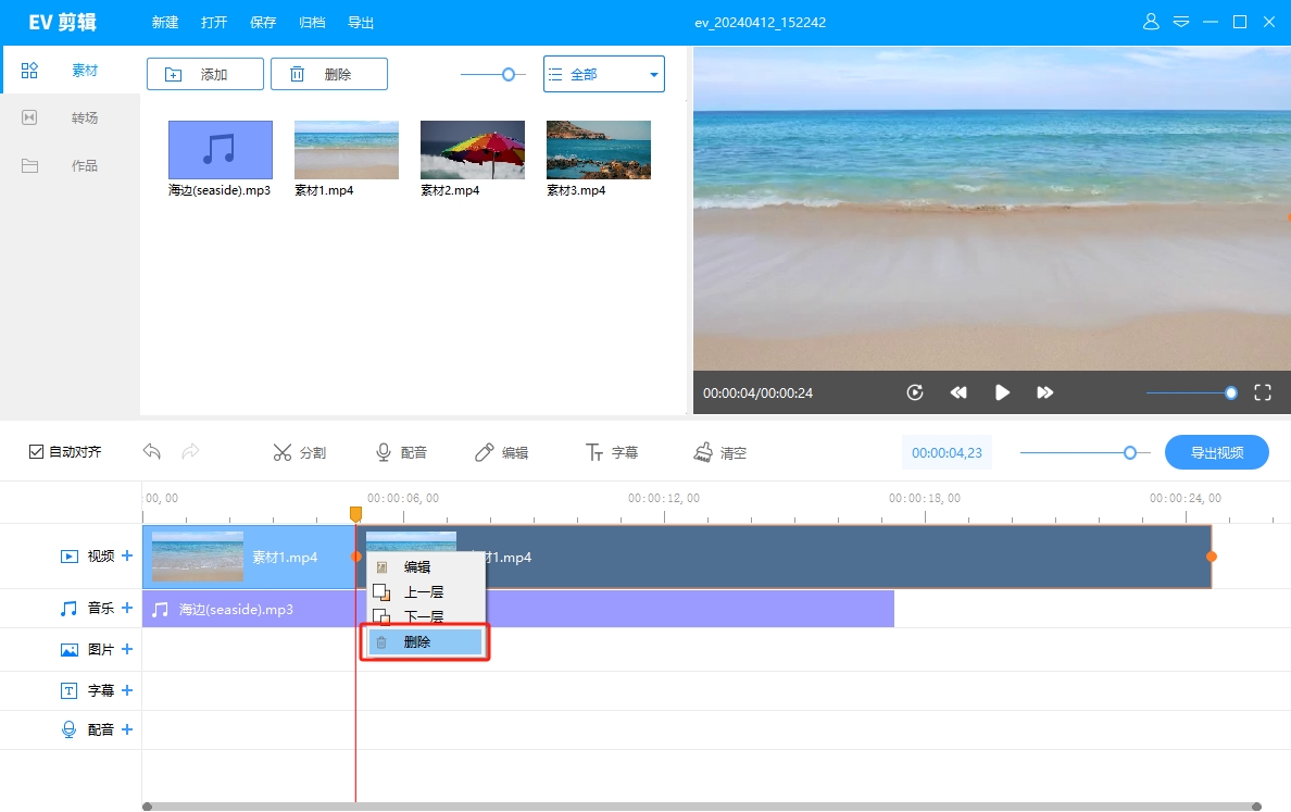 EV剪辑是一款功能较为全面的视频剪辑软件,操作相对简单,支持裁剪、拼接、添加字幕、应用滤镜、调整音频等基础操作,也有画中画效果、色度键抠图等进阶功能,支持多种视频格式输出,能满足多种剪辑需求。操作界面简洁直观,各功能板块布局清晰,新手容易上手,可快速找到所需功能按钮。