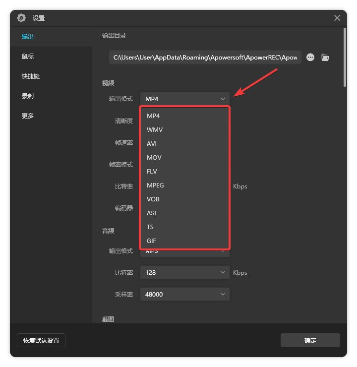 2、录制的视频拥有mp4、mkv、mov、wmv等多种输出格式