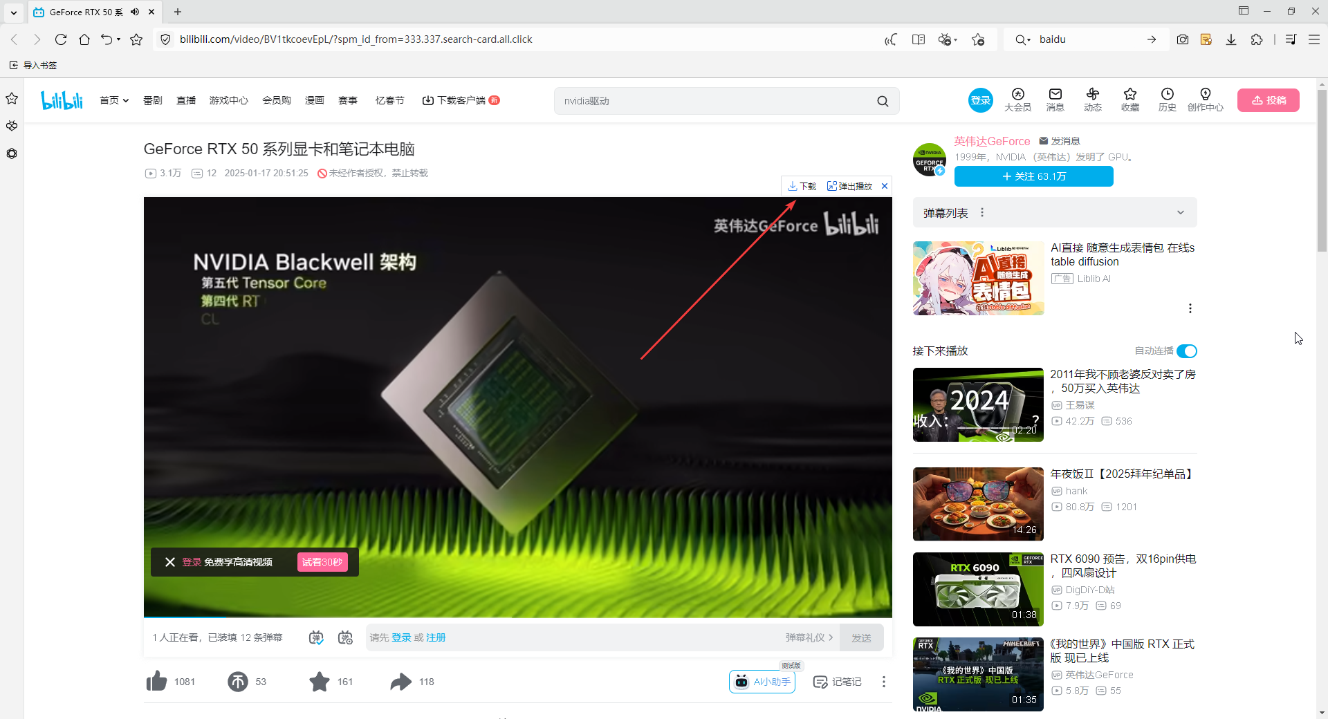 3、在视频播放窗口的右上角会有下载按钮,登录后即可使用该功能