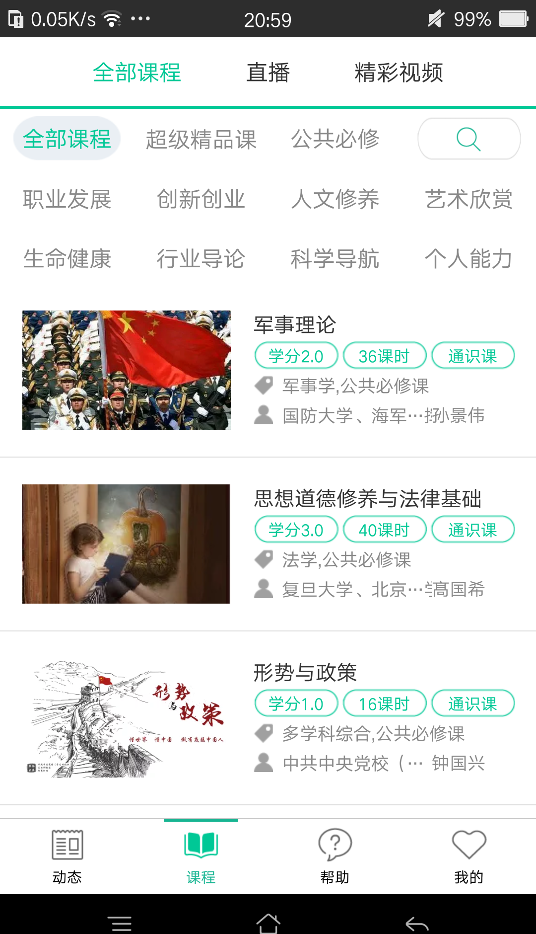 2、可以观看课程,课程分为全部课程、直播、精彩视频,课程为动态获取;
