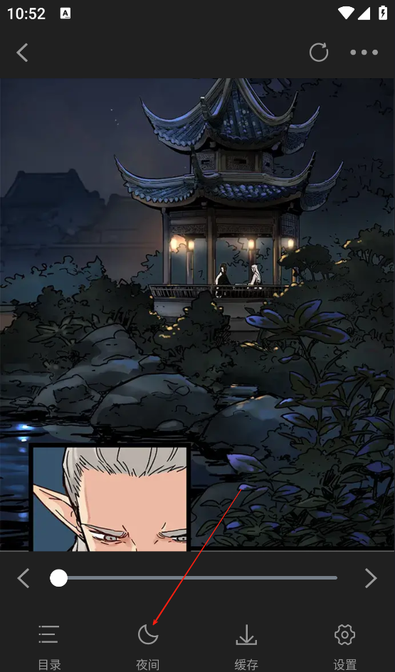 3、在阅读的过程中也可以进行切换,点击漫画中间位置唤起设置,然后点击夜间即可开启。