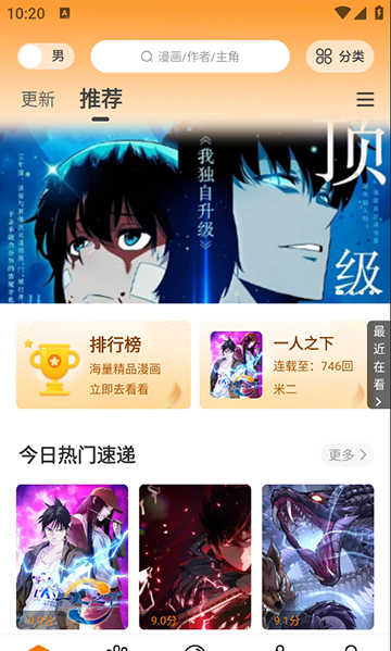 2、在首页查看“推荐”“热门”等分类漫画,或在搜索栏输入关键词查找。