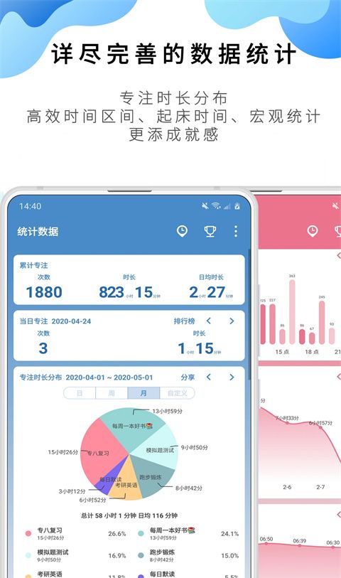 1.完整的数据分析为你提供了巨大的成就感,同时也分析了你的高效时刻。并提供每日、每周和每月时间段的分析,以及详细的历史记录。