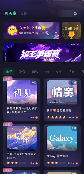 2、高清语音房:提供多人语音聊天室,涵盖情感倾诉、游戏连麦、深夜电台等主题,声音传递温度。