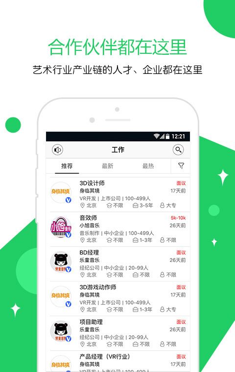 针对全艺术公司和艺术专业人才打造的高端专业招聘平台,包含全艺术类、演艺、影视、动漫、音乐、互动游戏、广告传媒、设计、绘画艺术八大艺术专业,为艺术行业提供独立的招聘渠道和合作空间。