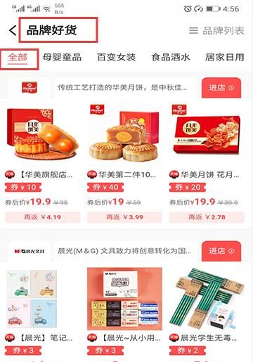4、点击品牌好货入口,筛选分类如全部、母婴童品,查看品牌商品及专属优惠。
