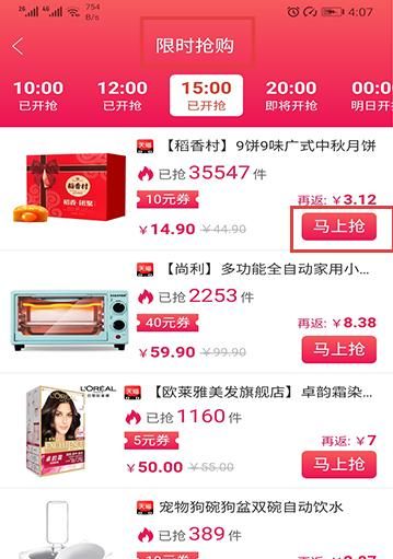 3、进入限时抢购专区,选择场次,点击商品马上抢,领取优惠券并下单。