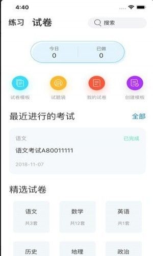 主要是用于考试相关的。你可以在这里选择一份试卷进行考试,也可以选择一套试卷模板生成一份试卷,然后自己考试或者分享给朋友练习,你甚至可以根据自己的学校情况创建试卷的模板。你最近的考试会被记录下来,方便你下次继续考试或者查阅。