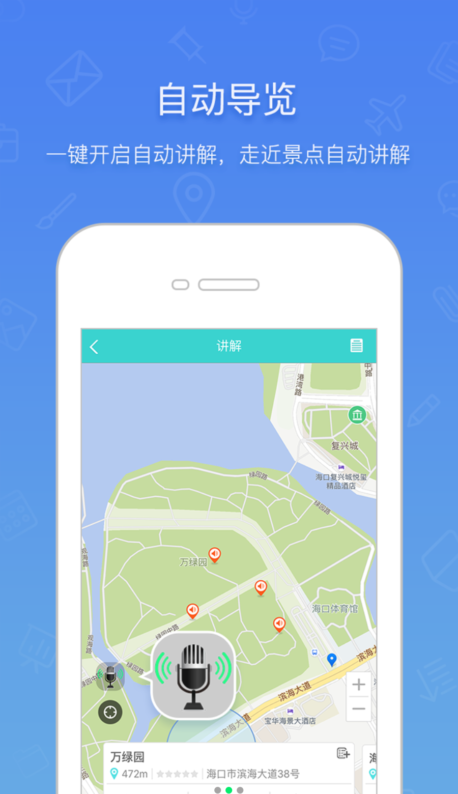 点击自动导览,景点讲解进入讲解地图界面,点击小喇叭进入导览状态,用户持手机进入景区范围,自动出现讲解点,距离讲解点20米左右自动开始语音讲解。