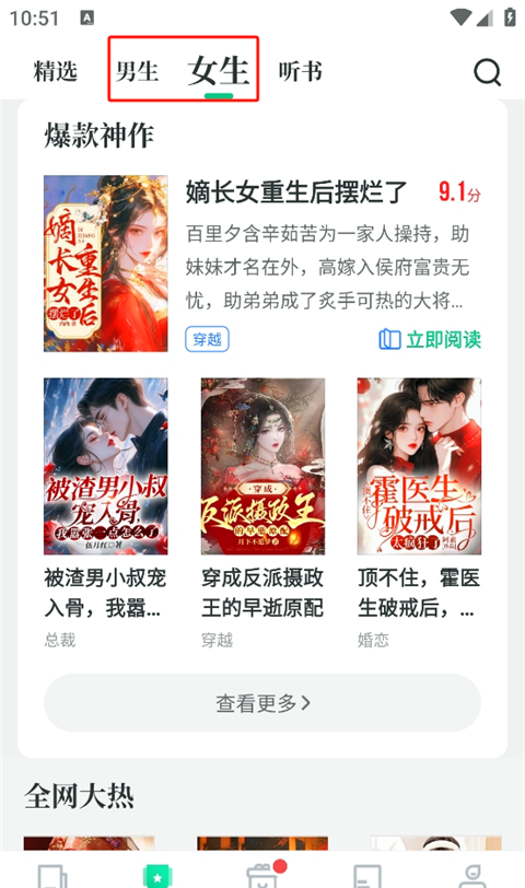 1、打开主页面,可以选择您的阅读爱好,比如男生女生热搜书籍推荐等,还可以选择有声书。