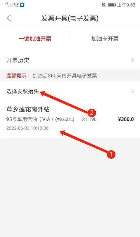 3、进入【开具发票】界面,首先选择需要开票的加油订单,然后选择【发票抬头】。