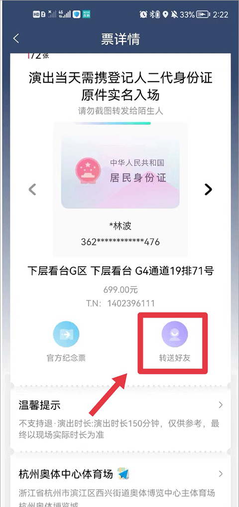 3、然后选择你要转送的票以及接受人信息后点击转送好友