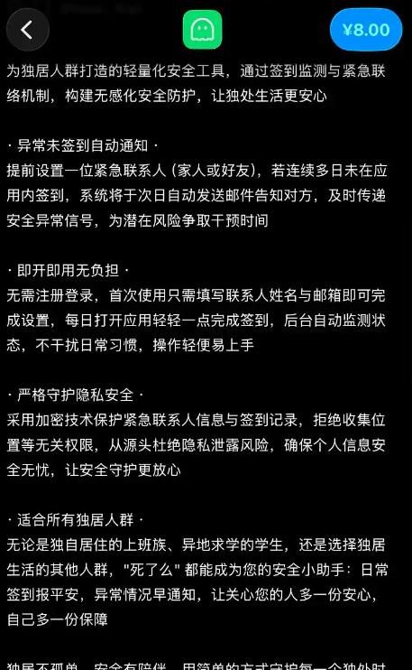 据介绍,该应用是为独居人群打造的轻量化安全工具,用户需要设置紧急联系人并签到,若连续多日没在应用内签到,系统将于次日自动发送邮件告知紧急联系人。
