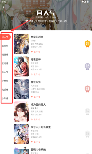3、进入排行榜可查看月人气、新作榜等多种热门榜单。