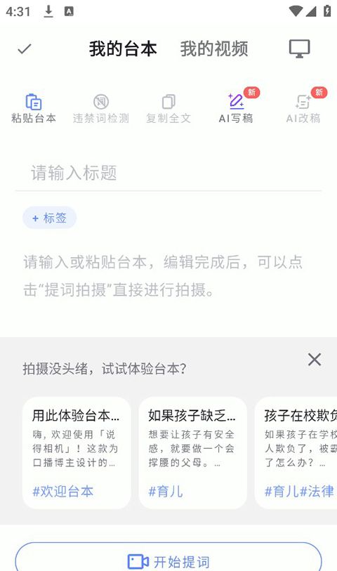 3、新建台本后,用户需要输入视频所需要的台本内容以及自己定义标题。