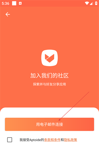 3、在注册界面选择“通过邮件连接”,需要先查看接受条款和隐私政策。该应用程序支持社区功能,需要注册。