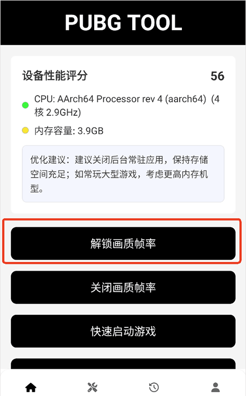1、在本站下载完软件后,打开进入到主界面点击解锁画质帧率。