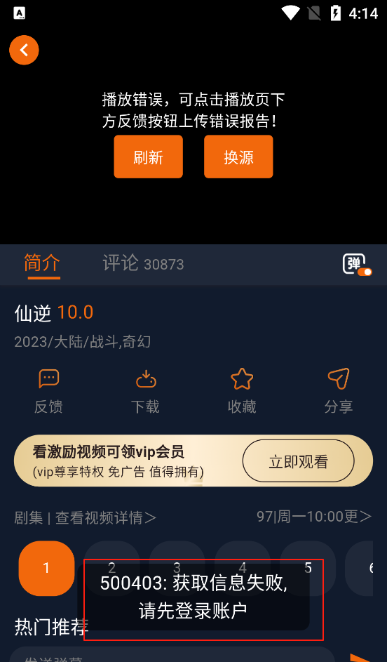 3、这边如果显示获取信息失败需要先注册登录才能观看动漫视频
