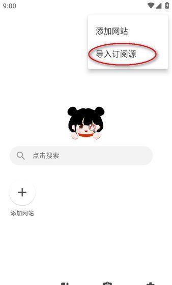 1、进入搜索应用后,点击右上角的三个点,选择“导入订阅源”。