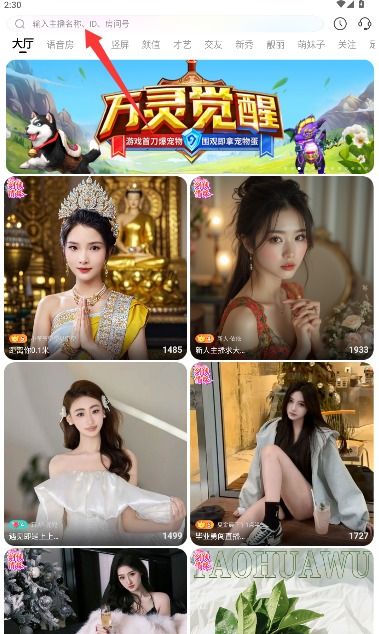3、在首页导航栏的搜索框中输入特定主播的昵称或专属ID,即可检索到目标用户主页。