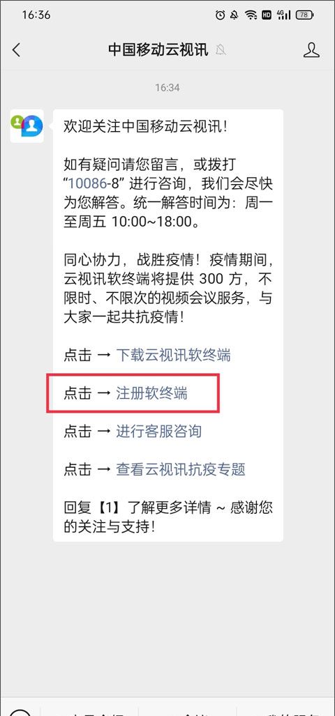 1、第一步首先关注“中国移动云视讯公众号”,点击“注册软终端”。