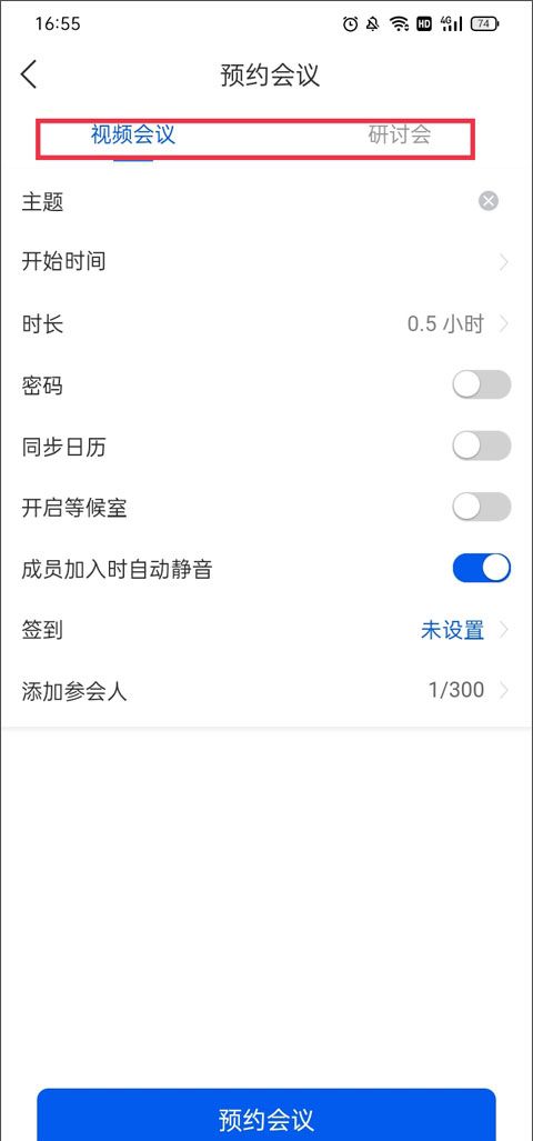 点击“预约会议”,可发起“视频会议”或者“研讨会(需开通权限)”。