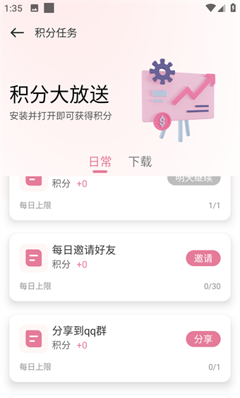 2、积分大放送中就能够通过完成各种任务去进行积分的领取,有日常任务也有下载任务。