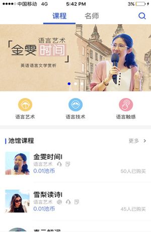池馆app官方版是一款提供语言知识的在线教育软件,你可以在平台上获得英语、日语等很多课程内容,都是在你眼前免费推荐的,直接跟随专业老师学习,你自己收集的课程也可以在平台上查看,数据非常详细,掌握个人学习进度。邀请国内外知名教授和专家,通过文字、音频和视频等形式,提高语言艺术素养和语言技术,提供线上线下语言互动学习和学习交流活动。