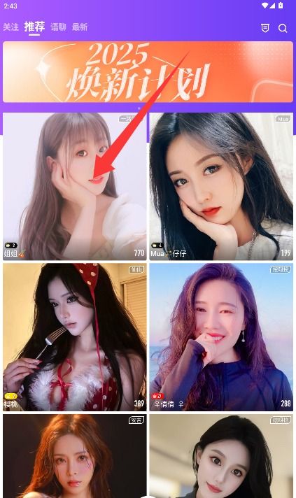 3、在推荐页面浏览系统精选的优质主播时,点击感兴趣的主播封面进入直播间。