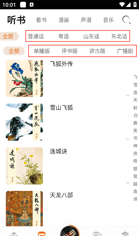 5、除了在首页搜索外,听书馆集成了各种书籍分类,从普通话到东北话,单播版到广播版,应有尽有;