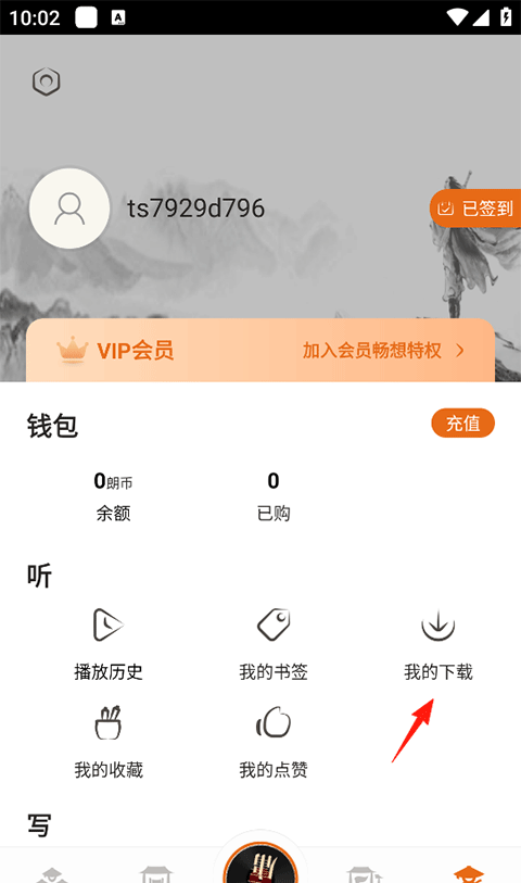 7、最后登录后可以在我的页面查看播放历史、书签、下载、收藏及点赞等。