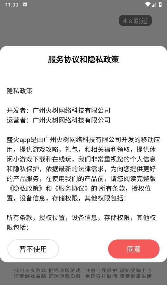 1、下载安装好盛火游戏app之后,查看并同意相关的政策与协议。