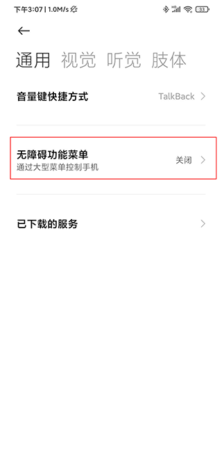 2.将无障碍功能菜单选项开启。