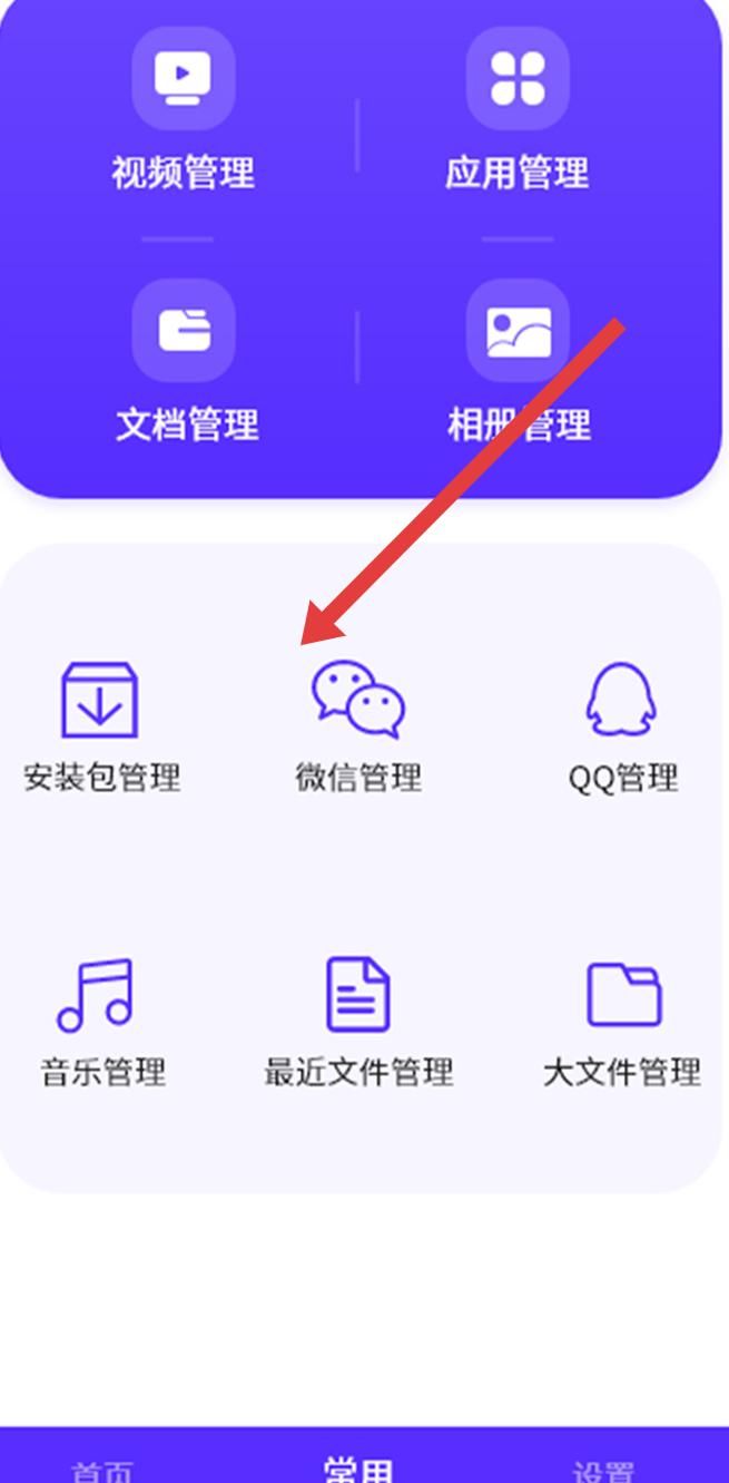 2、有视频、应用等管理选项,红框箭头指向微信管理,可针对性清理微信冗余数据。