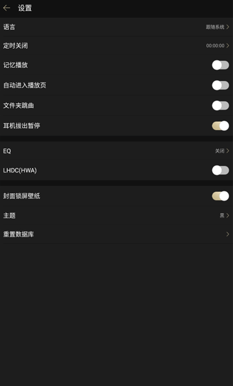 7、除此之外,我们在设置中还可对其设置定时关闭、记忆播放、耳机插出暂停、主题等设置。