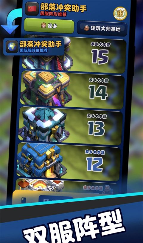 部落冲突助手是一款专为部落冲突游戏玩家设计的全面辅助工具,应用集成了多种实用功能,帮助玩家更好地规划游戏策略、提高效率和管理资源。软件提供了资源管理提醒功能,及时提醒玩家收获资源和升级建筑,避免资源浪费。同时,根据玩家的当前等级和资源情况,该应用还能制定最优的建筑升级计划。提供了超多国服和国际服的阵形供玩家免费复制使用。这些阵形涵盖了护资源、冲杯、部落战、创意、升级等多种类型,满足了玩家在不同场景下的需求。
